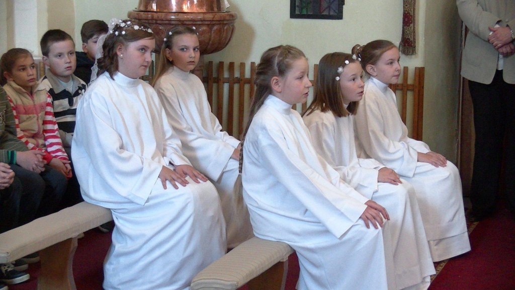Húsvét második vasárnapján, az Isteni Irgalmasság vasárnapján járultak először szentáldozáshoz harmadikos hittanosaink templomunkban. 10 gyermek, köztük 4 fiú és 6 lány vette magához e napon először az Oltáriszentséget. Szorgalmasan készültek szüleik támogatásával a nagy napra, és a szertartás előtt elvégezték első szentgyónásukat is.