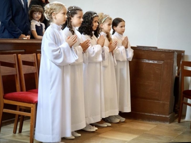 Jézus felment a mennybe az apostolok szeme láttára – hallottuk az olvasmányban -, mégsem hagyta el a Földet, nem hagyta magára Övéit. Aki hisz benne, azzal örökké jelen van. Kívánjuk, hogy elsőáldozóink életét betöltse az öröm, hogy Jézus, mint egy igaz barát mindig álljon mellettük. Kérjék bátran segítségét, és ő kézen fogja őket.
