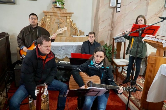 Ezután következett a délután fénypontja, a szentmise a börcsi templomban, mely zsúfolásig megtelt-legnagyobb örömünkre! Zsolt atya gyerekekhez szóló kedves szavai, a Totus Tuus ének- és zenekar szívet-lelket melengető éneke tette emlékezetessé ezt a szentmisét, melynek végére Szent Miklós püspök meghozta a hóesést és az ajándékot! Mindannyian, szívünkben egy varázslatosan szép délután emlékével tértünk haza.