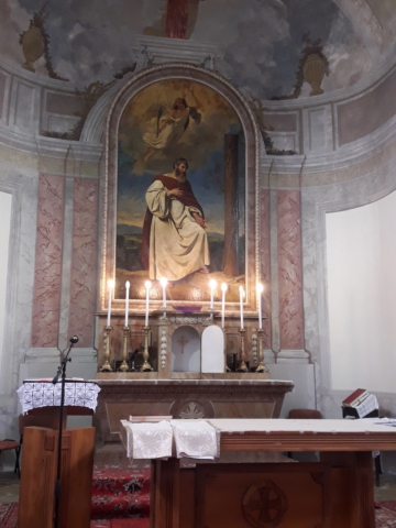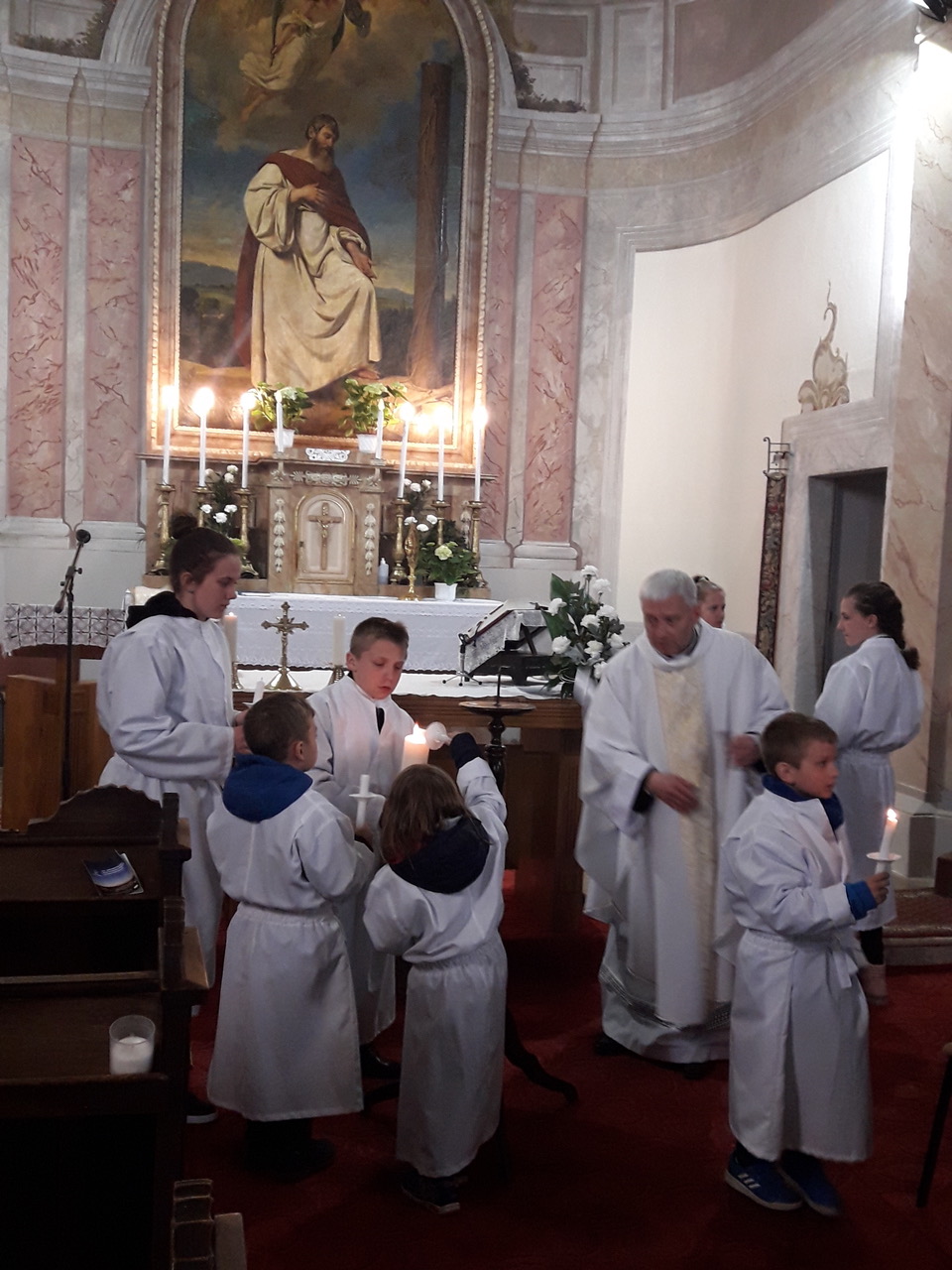 Megható, áhítatot ébresztő jelenet volt az, amikor az oltárfosztásra készülve az Oltáriszentséget átvitte Zsolt atya a főoltár tabernákulumából a Jézus Szíve mellékoltár szentségházába. És lezajlott az oltárfosztás, amely Jézus szenvedését, ruháitól való megfosztását, magányosságát jelképezi. Minden virágot, terítőt, díszt, még a feszületeket is leszedte főtisztelendő plébánosunk az oltárról, majd a segédkező ministránsok azokat elvitték. A nyitott tabernákulum ajtó szimbolizálta, hogy nincs jelen Jézus Krisztus, nincs ott az Oltáriszentség. A csupasz, díszeitől megfosztott oltár valóban segít megértetni azt a rideg, magára maradottságot, amelyet az Úrnak az elárultatása éjszakáján át kellett élnie.