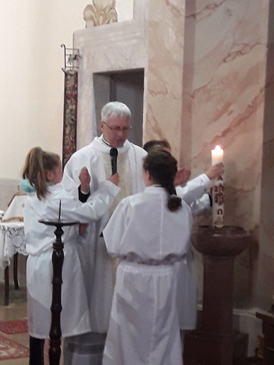 Nagyszombat még az elcsendesedés napja. Azonban az este már Húsvét vigíliája, ez már a Húsvét örömében zajlott. A templom bejáratánál a szürkületben zajló tűzszenteléssel kezdődött a szent liturgia. Ezt követően fény áradt szét a templomban, a ministránsok a húsvéti szent gyertyáról gyújtották meg a hívek mécseseit. A fénytelen homályt elűzte a fény. A mise elején elhangzott három olvasmány a világot és embert megteremtő Istenről, aztán a népét megszabadító és az embert megtisztító Istenről szólt. A Dicsőség éneklése közben felzúgtak a harangok és az orgona, ismét megszólaltak a csengők a feltámadt Krisztus dicsőségét hirdetve. Ünnepélyesen, örömteli szívvel énekeltük mindannyian az Alleluját. A megváltás öröme állt a szentbeszéd középpontjában is. Majd a vízszentelés és a keresztségi fogadalmunk megújítása tette még ünnepélyesebbé a szentmise szertartását.