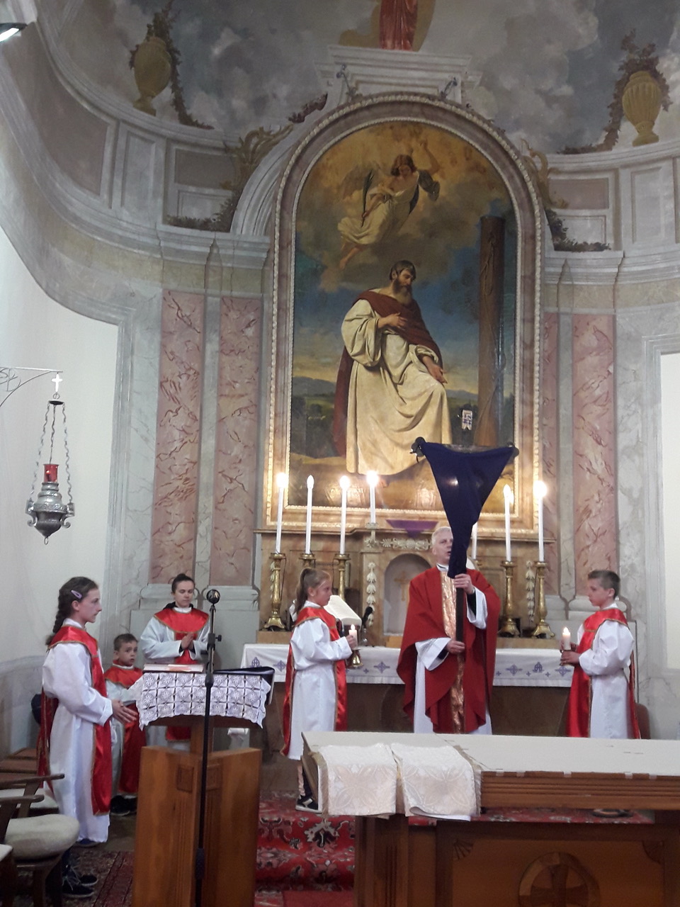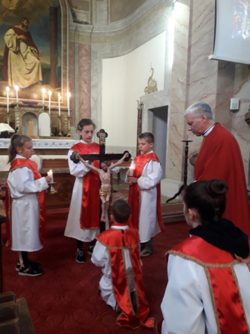 Nagypénteken úgynevezett csonka mise volt, amelyen az Úr szenvedéseire emlékeztünk. A szertartás keresztútjárással kezdődött. A ministránsok, akik között voltak egészen kicsik, és ott voltak a nagyok is, igen felelősségteljesen és mély átéléssel haladtak végig a stációk előtt. Ők vitték a keresztet, és mi velük imádkozva, elmélkedve, énekelve éltük át a keresztutat.