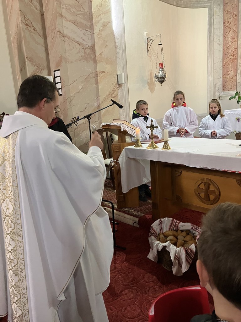 A nap zárásaként a börcsi Szent Bertalan templomban gitáros misén vettünk részt. Csodálatos volt látni ahogy a templom megtelt gyerekekkel és a családjukkal. A misén a zenei szolgálatot a TOTUS TUUS ének- és zenekar végezte. A szentmise végén Balázs atya egy hatalmas kosárnyi Erzsébet cipót áldott meg, amiből mindenki vihetett haza magával, emlékezve Erzsébet csodájára, és emlékeztetve minket a helyes útra.
